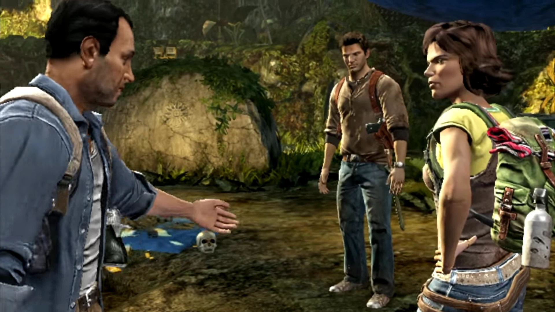 Натыкаясь на статую в виде жабы, Джеймс Данте говорит Нейтану, что надо наверх этой статуи подниматься. Двигаясь дальше, они пришли к бревну в виде моста на другую сторону. Осторожно шагая по бревну, Данте неподалёку заметил статую, на глазу которой что-то блестело и предложил Дрейку осмотреть её, сомневаясь, что тот не пройдёт через бамбуков. Нейт, возмутившись, показал своё мачете и пошёл к статуе другим путём. Попав на место, Нейт с мачете убирает бамбуков, которые мешают ему подниматься по статуе, и находит там глиф из бирюзы. Дрейк по уступам дальше двигается и попадает на другую сторону скалы, в то время Данте тоже перешёл туда по бревну. Далее они пришли на другую сторону ворот, которые были заперты в начале первой главы. Нейт возмутился на то, что они всё это время прошли по обходному пути, и Данте ответил, что осталось ещё чуть-чуть до точки. Там наверху оставленного старого самосвала заметившие двое наёмников, видимо, охраняющие эту местность, начали стрелять по путешественникам. Справившись с ними, они идут дальше и натыкаются на ещё одни запертые ворота, на которых кодовый замок. Данте даёт Дрейку комбинацию кодов, и тот взломает замок.