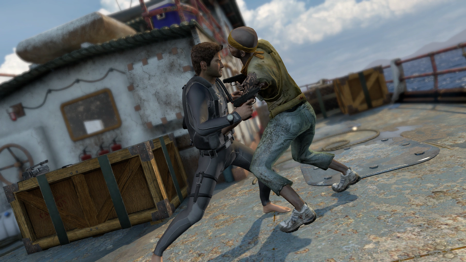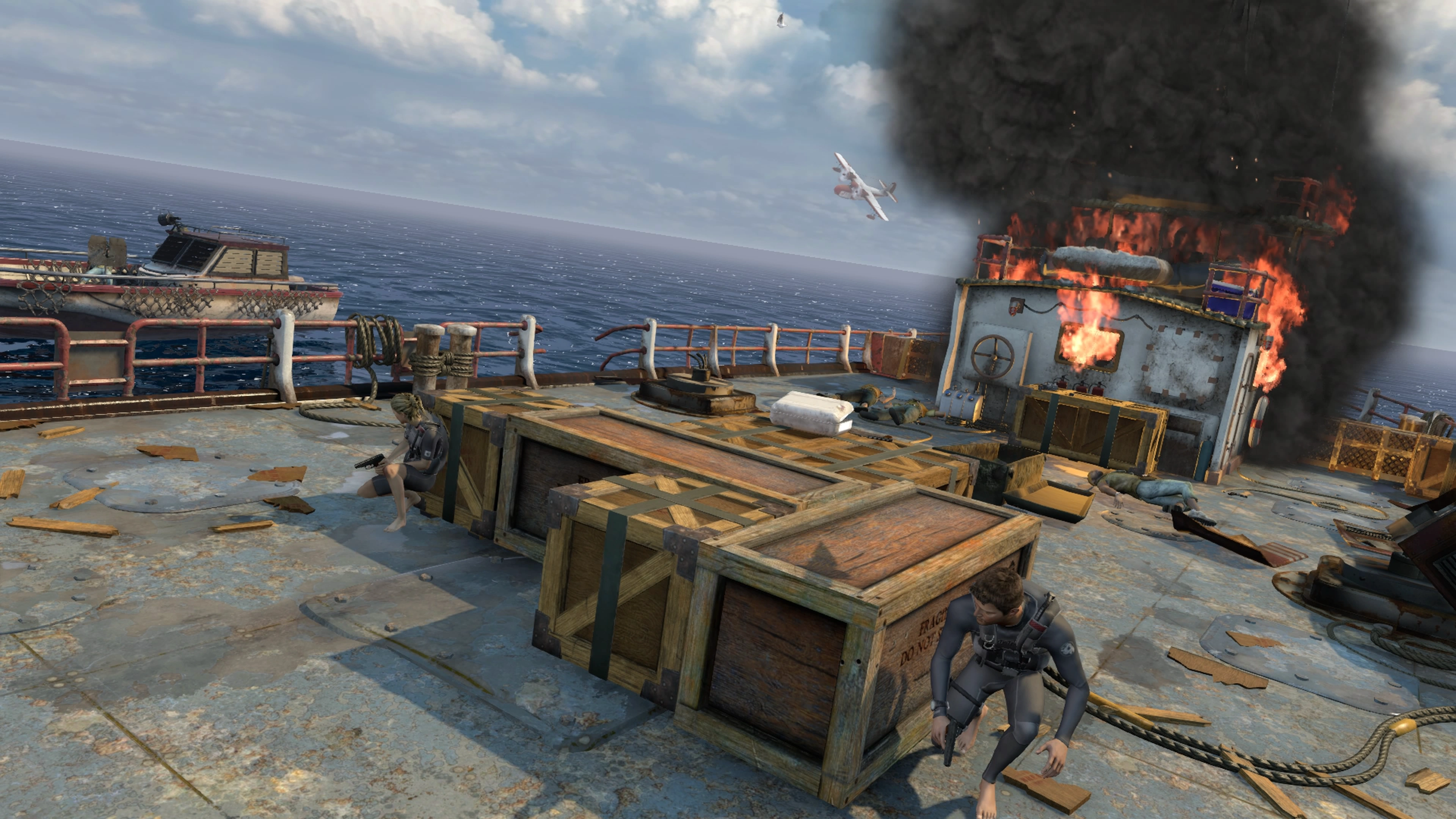 Once the deck is clear, a gunboat equipped with a mounted machine gun and a rocket launcher appears. Avoid taking cover behind the cranes, as they are eventually destroyed by rockets. Instead, use to take cover behind the crates until Sully's plane arrives. The game prompts you to look toward the plane, but you should stay behind cover as the gunboat circles the ship. Move between cover points as necessary to stay out of the turret's line of fire. Once the gunboat completes it rotation, the pirates will retreat, and a cutscene will follow, ending gameplay of the chapter.