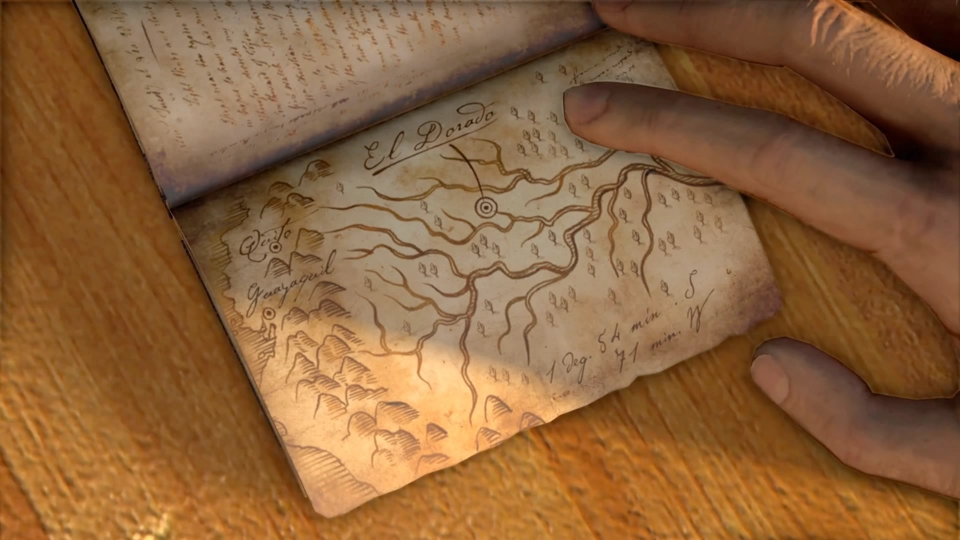 Back at the shore, Nate and Sully discussed the diary aboard Sully's boat while Elena spoke with her producer regarding the pirate attack. Nate explained that Sir Francis likely hid his final discovery to prevent it from reaching the English Crown, pointing to a page mentioning "El Dorado", the fabled city of gold. Despite the final page being missing, the duo decided to pursue the lead. Fearing Elena's involvement would attract unwanted attention, Nate and Sully sailed away while she was distracted by her phone call. Elena realized the deception too late and was left behind on the dock.