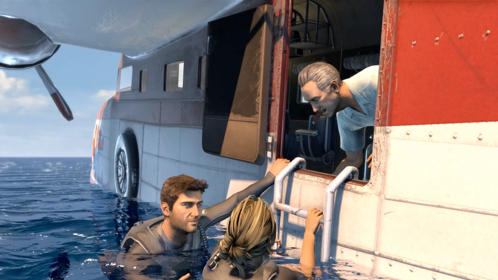 Sully helping the Nate and Elena into the plane.