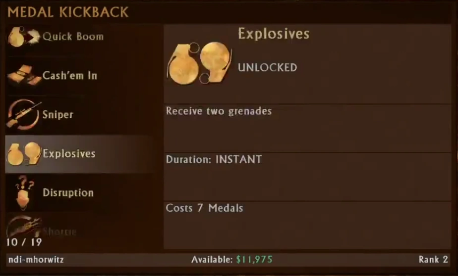 Explosives is a medal kickback available in Uncharted 3: Drake's Deception. When activated, it gives the player two grenades. It costs 7 medals to activate.