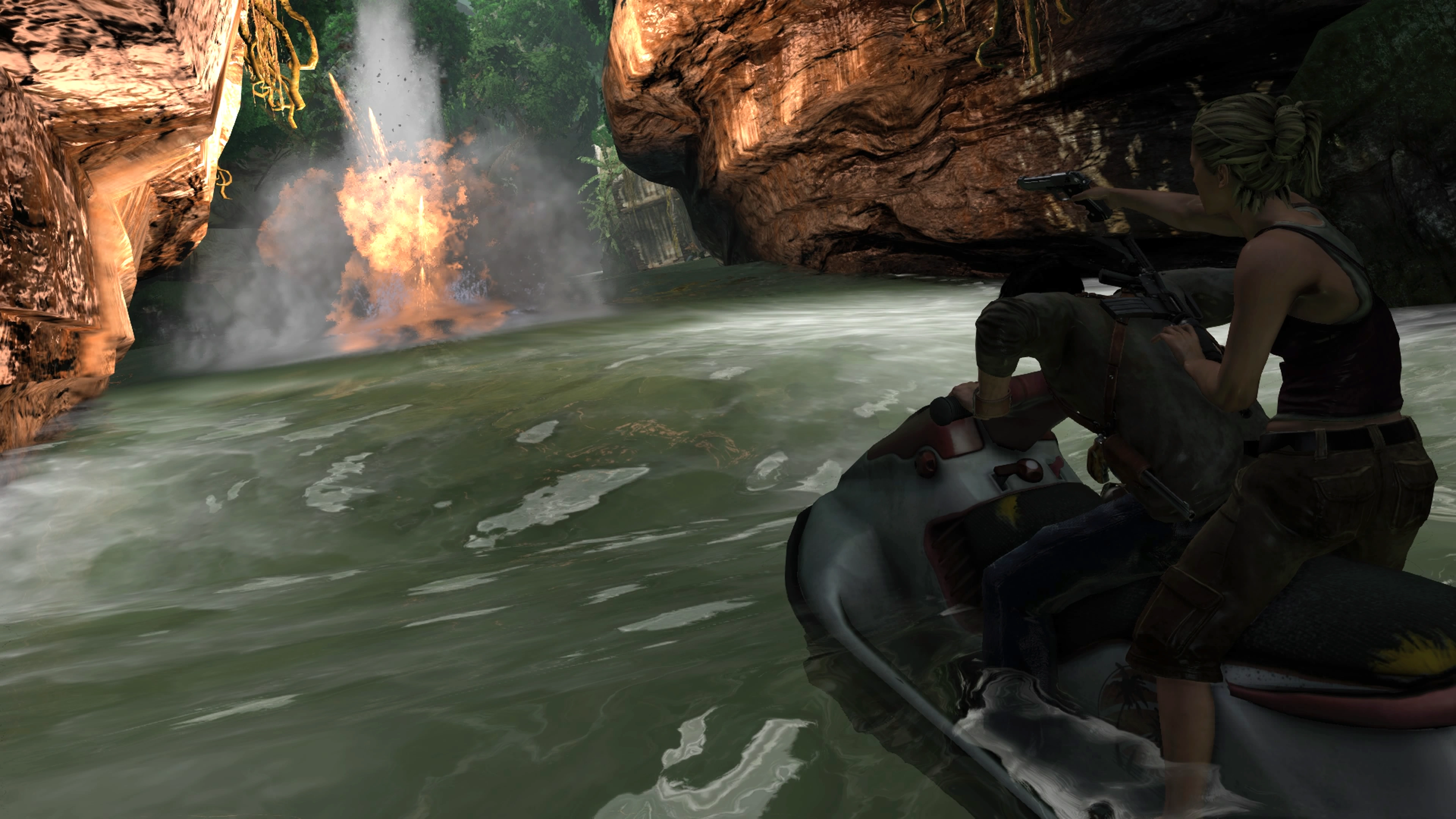 Players once again control Nate on a jet ski, though Elena provides support this time with a 92FS - 9mm having unlimited ammunition. Navigating the river is a challenge, as the strong current frequently hinders steering. Explosive canisters also pose a constant hazard as they float downstream toward the player; it is best to slow down and shoot these from a safe distance. Elena’s ability to blind-fire allows players to eliminate barrels and enemies while maintaining forward momentum.