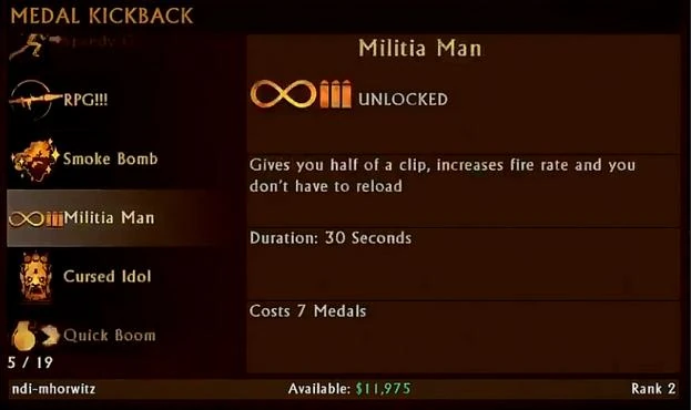 Militia Man is a medal kickback available in Uncharted 3: Drake's Deception. Once activated, weapon reloading is disabled for 30 seconds, thus allowing the user to fire for as long as their ammo supply allows. It costs 7 medals. Militia Man does not work on the RPG or the T-Bolt Sniper.