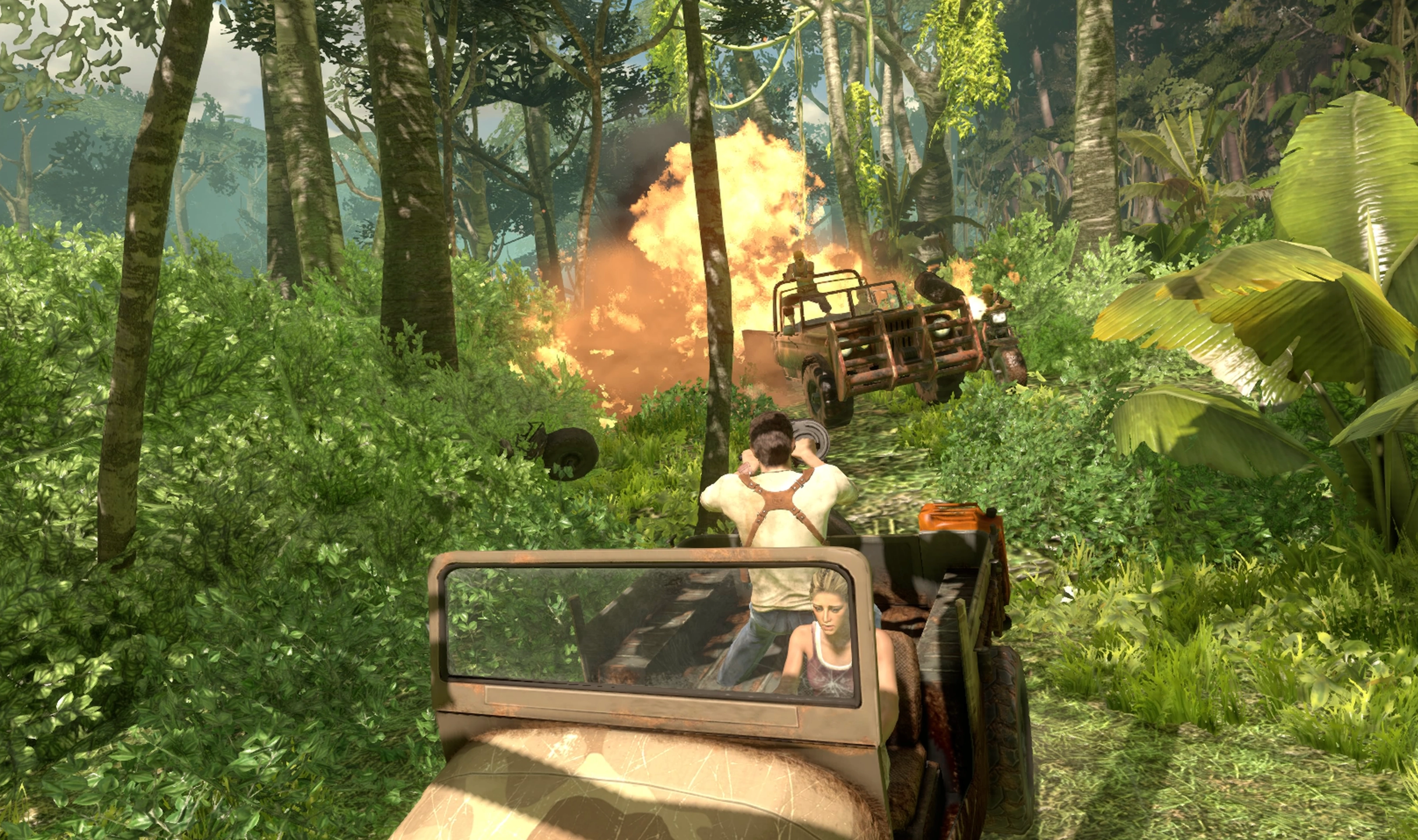 The chapter begins with Nate manning a machine gun while Elena drives through a jungle. To keep Eddy's men at bay, players can use the machine gun with the standard trigger or grenades with the aim button. Grenades have a longer reload time and are more suitable for large groups of enemies or trucks, while bullets are effective against smaller vehicles. Accuracy increases as the firing reticle shrinks, so it is recommended to maintain short bursts of fire.