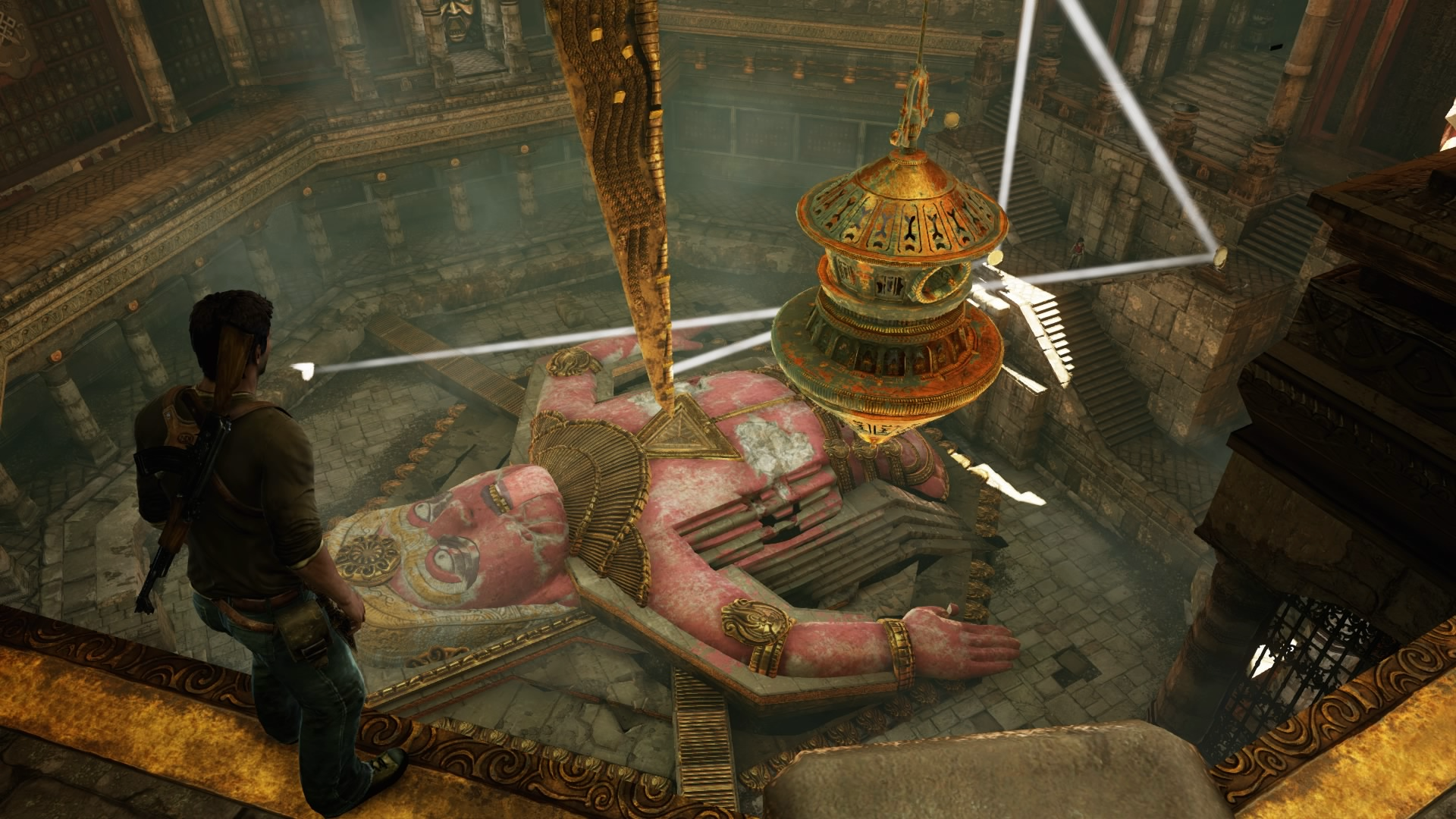 Chloe will adjust the second one for you, after which you can use yours to direct the beam into the green construction hanging from the ceiling, which directs it into the second face, revealing a second lock. Said lock will lower the second blade, which you must climb, repeating your previous' actions so far. While halfway across the third blade it will collapse, although Nate barely manages to hang on. At this point the only thing you can do is shoot the third eye on the larger statue's forehead nearby, which causes it to break open manually.
