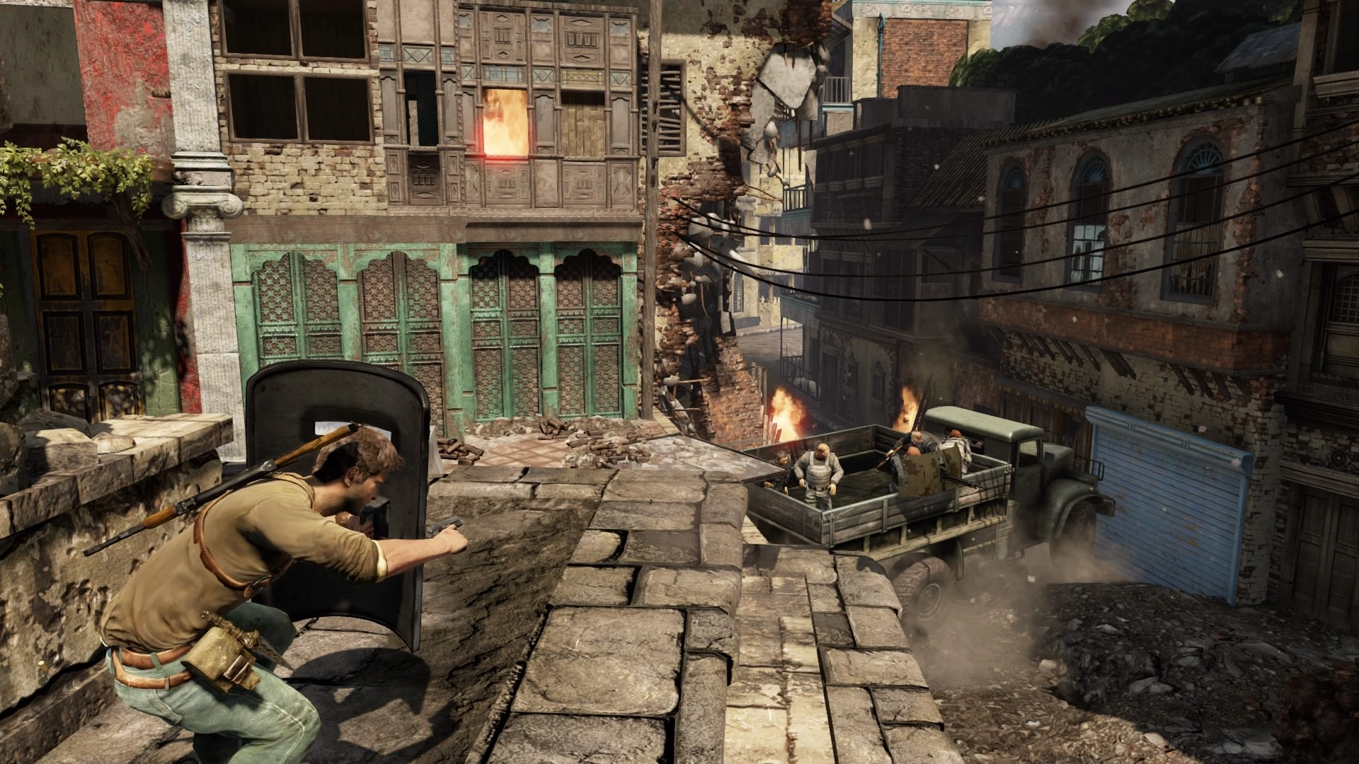 Continuous fire will also force shield-carriers to tire out and take a rest, leaving the shield slanted, which allows Nate to vault over it and beat them in a melee. Alternatively when tired out they are also easy to flank. If too close to an active shield holder they can retaliate with a shield bash, temporarily leaving them exposed, but also staggering any attacker if hit. Nate can use the shield to the same effect against enemies.