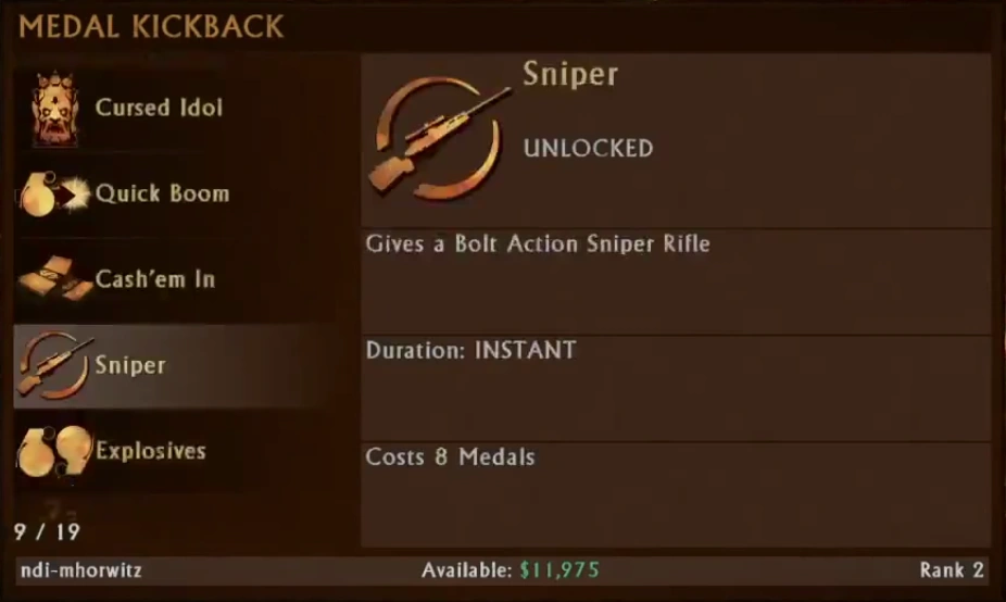 Sniper is a medal kickback available in Uncharted 3: Drake's Deception. It instantly gives the player a T-Bolt Sniper and costs 10 medals to activate. It becomes available when rank 23 is reached.