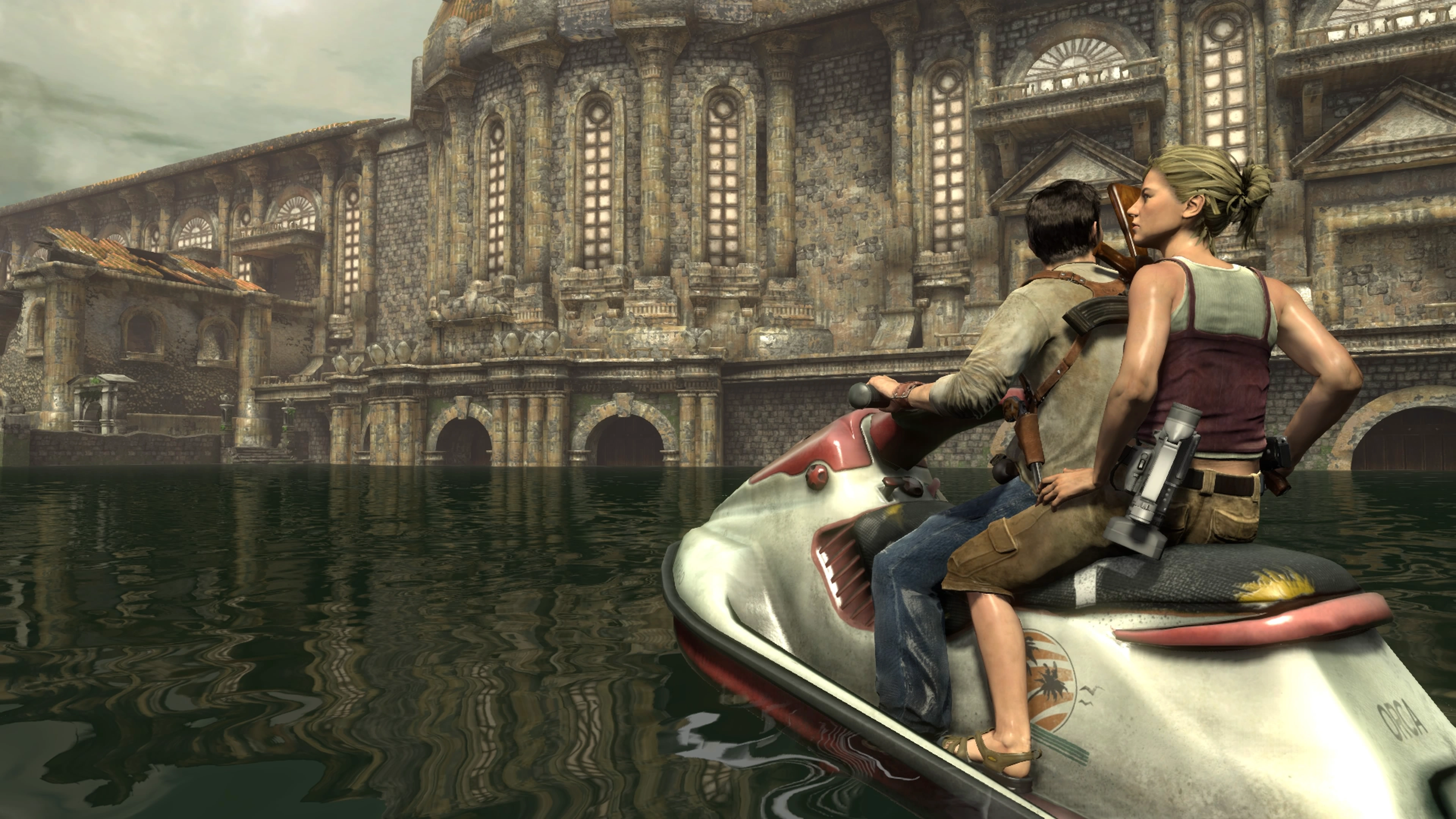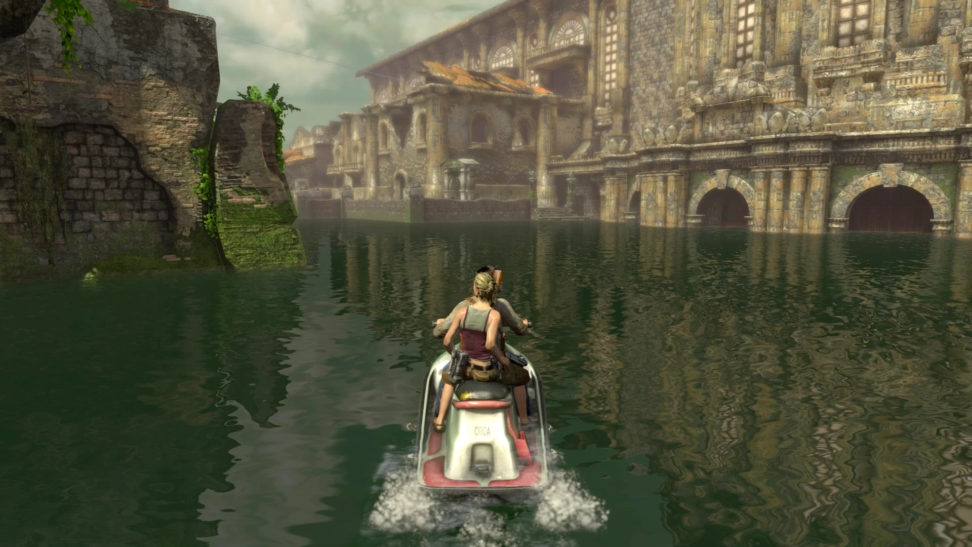 Using the jet ski, the two set off through the drowned city. While doing so, they encountered several of Eddy's pirates attacking them from within the old buildings and structures, as well as stumbling across several explosives placed within the water to stop them. As they soon approached the customs house, Elena mentioned reading stories of a cursed Incan treasure and began to suspect it may have had something to do with El Dorado. Nate laughed it off as superstitious nonsense, but Elena pointed out that something bad has happened to the place, and that a colony does not just vanish without reason.