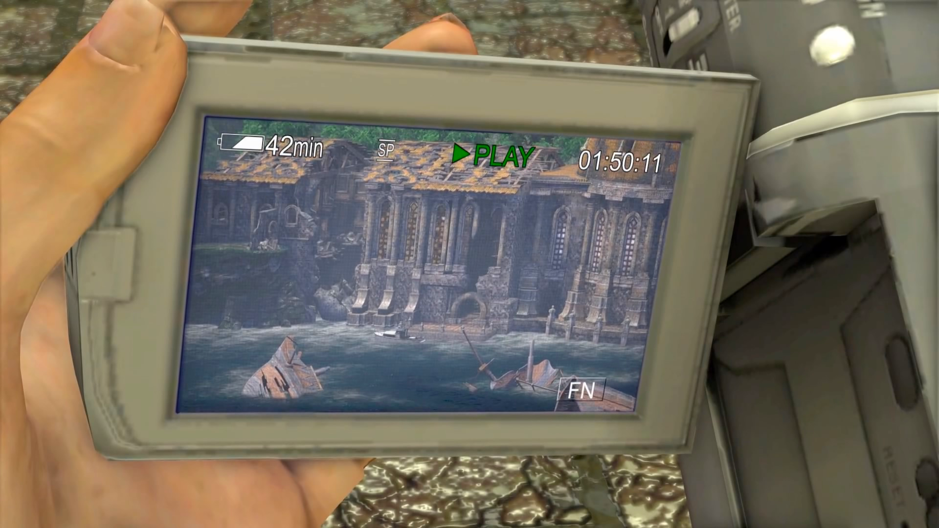 Nate and Elena swam out of their crashed jeep and into the flooded ruins of an old, abandoned colony. After the two defeated the last of Eddy's men, Elena showed Nate footage of what she had filmed back at the fortress. She pointed out a building in the harbor where the ships would have unloaded all of their cargo, further surmising that the El Dorado statue must have gone through there too.