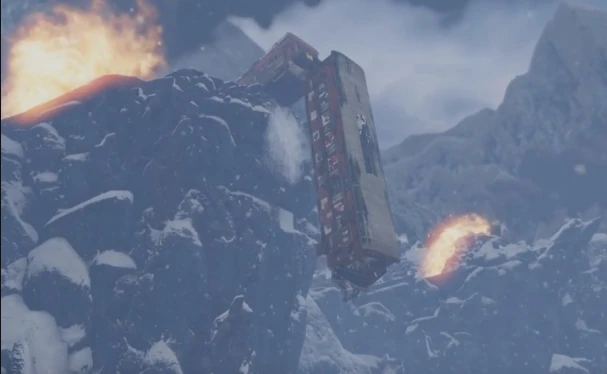 After being shot by Harry Flynn, Nathan Drake shot a propane tank inside the train as his last chance of escape. This causes a huge explosion, and the train derailing. Drake awakes to find himself inside a train suspended from a cliff. As Drake struggles up the train and onto the cliff, he hears soldiers moving in. He fights them off, still wounded, until he collapses into the snow.