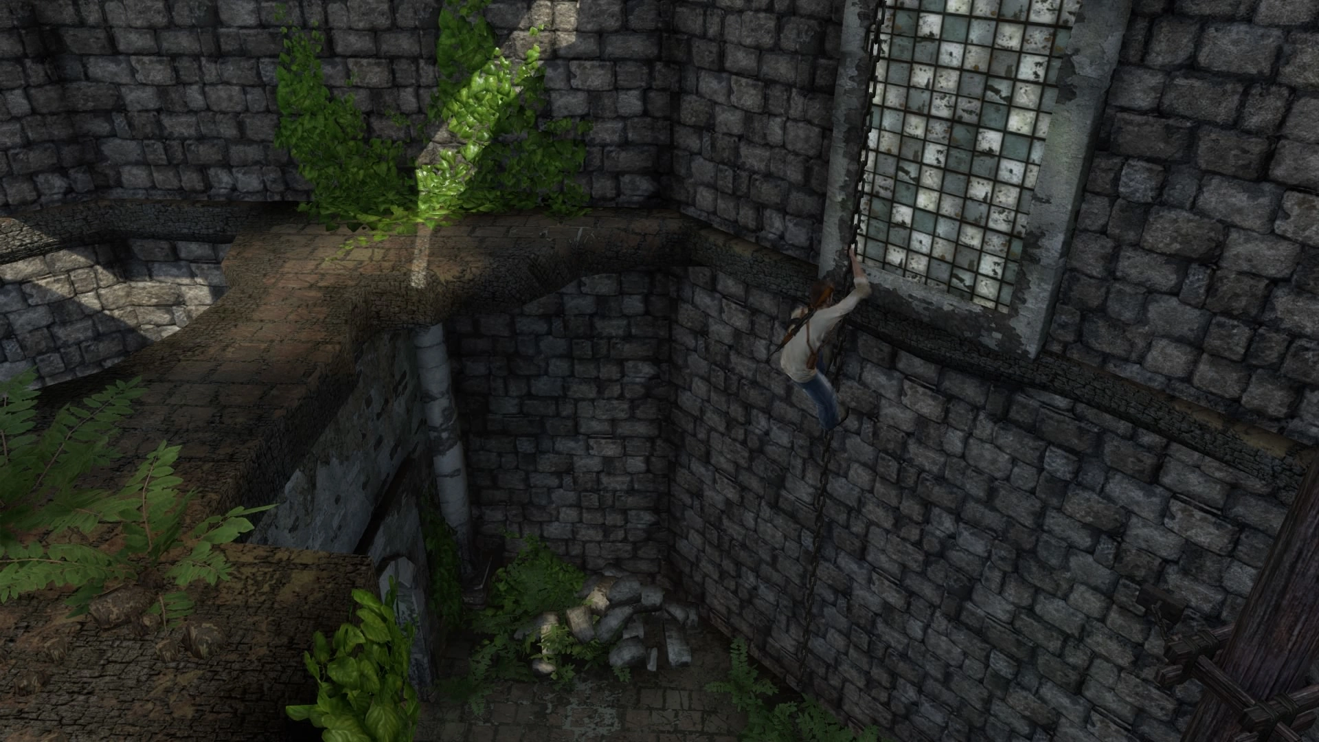 After navigating further through the flooded ruins, Nate and Elena reached a drop-off point. Nate proceeded alone to reach the tower while Elena returned to the customs house, intending to meet him there. Following several skirmishes with Eddy Raja's pirates, Nate reached the summit of the tower. He used a cable as a makeshift zipline to slide through a hole in the customs house roof. Once inside, he regrouped with Elena by opening the main doors, and the two continued their search for an escape boat.