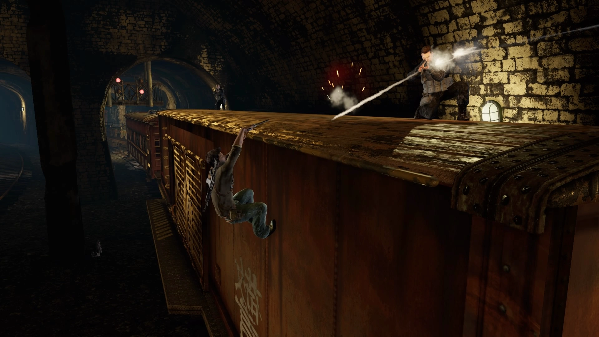 Draza will call in the helicopter, against which you cannot do anything for now. Advance through the train cars until you eventually stumble upon an armored car with a mounted turret. Use it to start firing on the gunship, who will periodically retaliate with missile volleys. You can shoot these down if you want, although they do not pose much of a threat. Eventually the helicopter will have taken too much damage and crash, after which Nate exits the turret and is forced to quickly take cover again due to Draza. He will quickly run away, leaving you to deal with the few remaining soldiers, including an armored shotgunner.