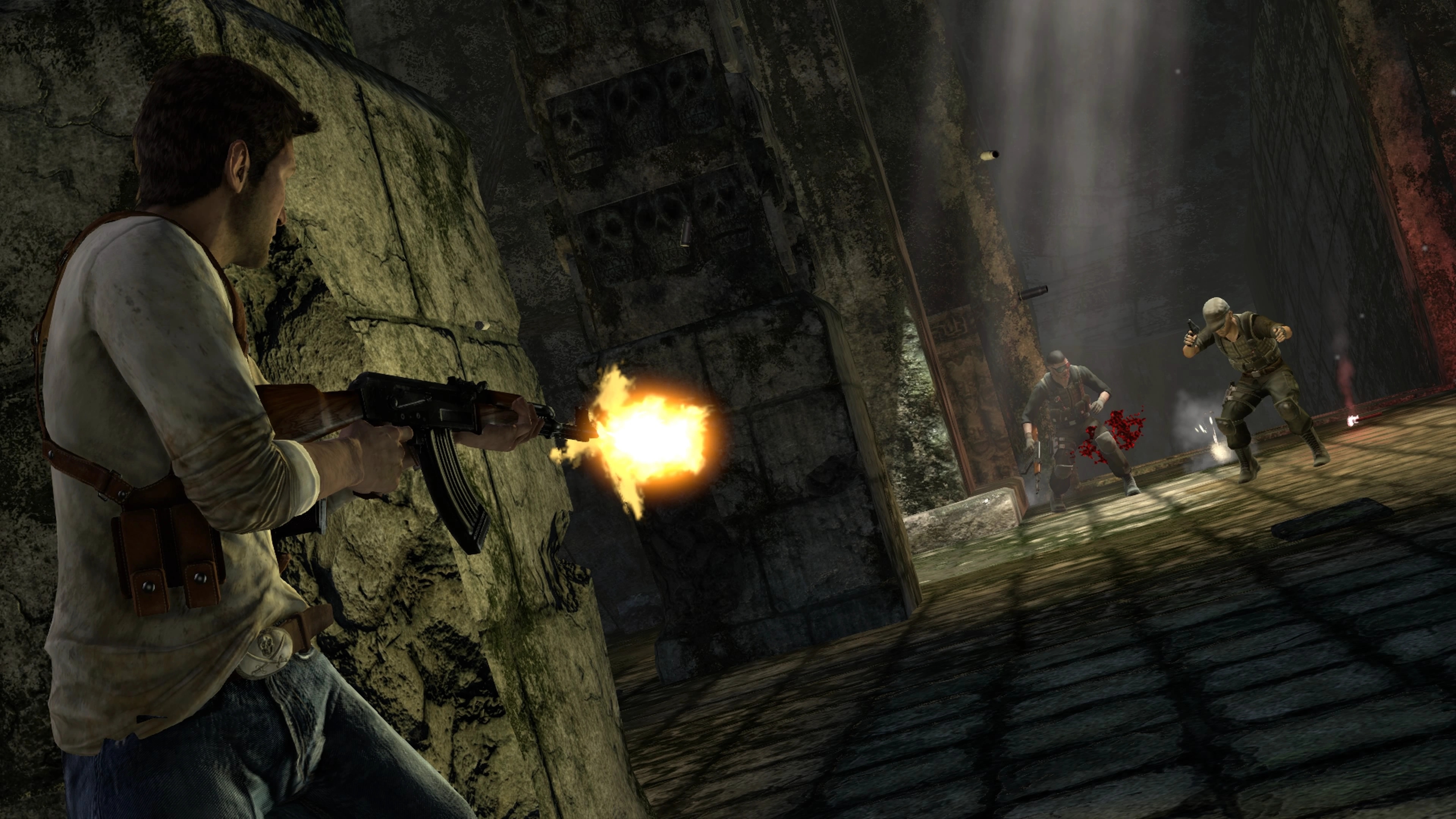 When engaging enemies up close, the player can have Drake perform melee attacks, such as the Brutal Combo, which are executed via button sequences. Using a brutal combo on an enemy causes ammo drops to be doubled. In certain situations, he can also sneak up on them from behind for an instant stealth kill. In the midst of combat, Drake can also take cover behind several obstacles, barriers, and walls, and is also able to blind fire at enemies while doing so to avoid return fire. Drake can also blind-fire without cover, with reduced accuracy but no need to aim. Several reviewers compared these third-person perspective elements to those of Gears of War.[3] Similarly, the game, as well as its sequels, features no health bar. Instead, the graphics will fade in color as the player takes damage. The screen color restores itself as the player avoids damage for a little while.